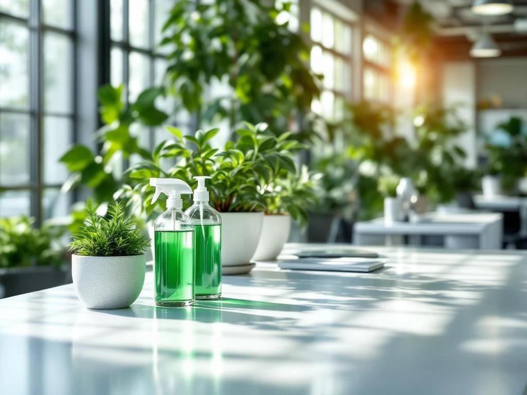Modern kantoor met duurzame schoonmaakmiddelen in glazen flessen, planten en recyclingbakken in natuurlijk licht