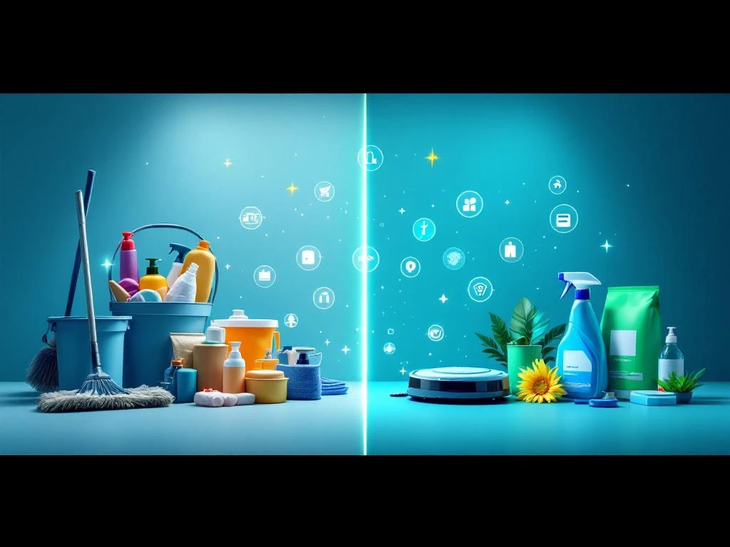 Schoonmaakindustrie evolutie Amsterdam: traditionele dweil en emmer links, moderne robotstofzuigers en UV-apparaten rechts