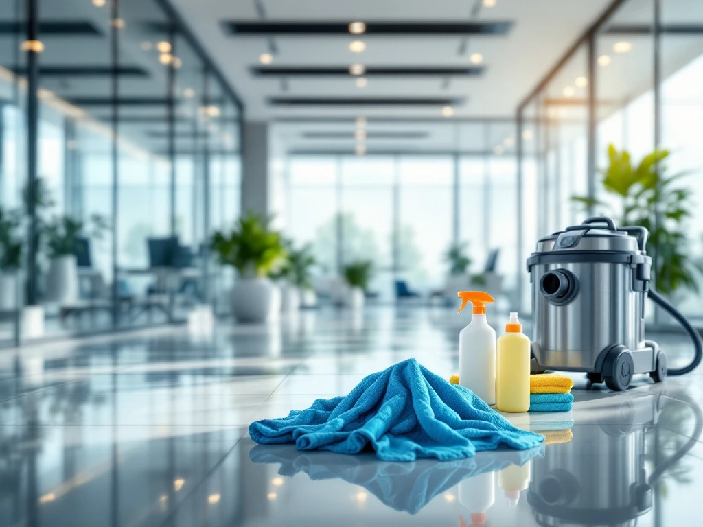 Professionele schoonmaakdienst in modern kantoor met glanzende vloeren, schone ramen en schoonmaakapparatuur