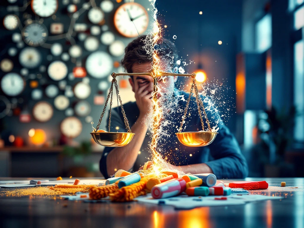 Gefrustreerde ondernemer tegenover georganiseerde Nederlandse schoonmaakdienst kantoor, weegschaal toont chaos versus orde