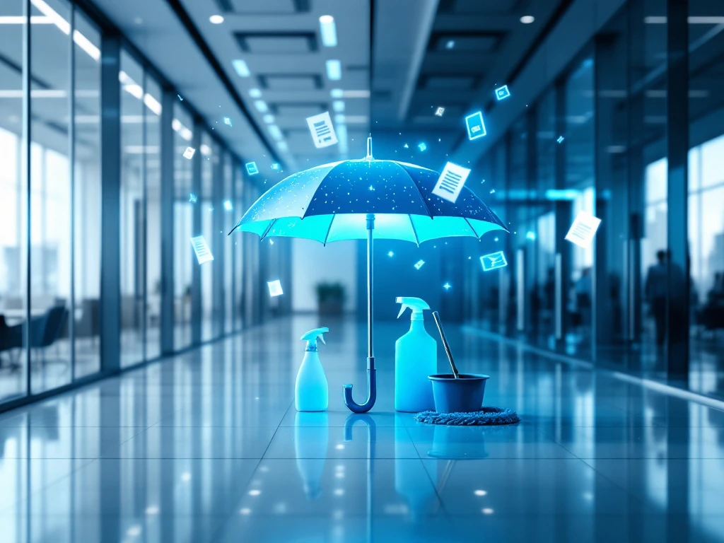 Gloeiend blauw beschermingsparaplu tussen moderne kantooromgeving en professionele schoonmaakapparatuur